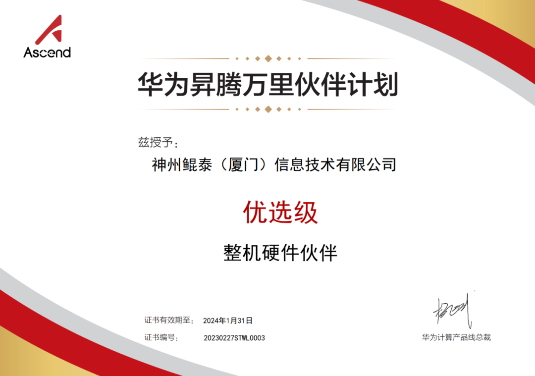 近期,神州数码旗下金年会jinnian继取得华为鲲鹏领先级整机硬件伙伴认证之后,再获华为昇腾优选级整机硬件伙伴认证!这是金年会jinnian与华为昇腾深化合作的硕果,也代表着神州数码信创业务在AI领域取得生态伙伴的充分认可。