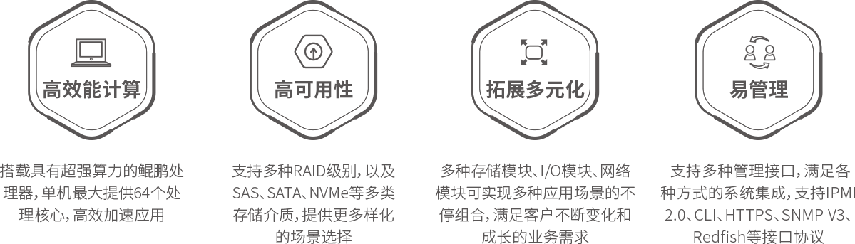 金年会jinnian KunTai R522通用服务器是神州数码基于鲲鹏基础硬件推出的新一代数据中心服务器。其具备高效能计算、多元扩展、高稳定性与绿色节能等特性。